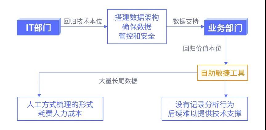 到了21世紀(jì),以有一定IT能力的業(yè)務(wù)人員為中心的自助式數(shù)據(jù)分析平臺(tái)開(kāi)始盛行,二代敏捷BI的熱潮襲來(lái),在這段時(shí)間里BI廠商也如雨后春筍般涌現(xiàn),并競(jìng)相大力發(fā)展可自助式分析的BI產(chǎn)品。雖然敏捷BI的出現(xiàn)一定程度上解決了部門(mén)協(xié)同的問(wèn)題,但是敏捷BI對(duì)于長(zhǎng)尾數(shù)據(jù)難以有效處理,同時(shí)分析經(jīng)驗(yàn)和知識(shí)體系難以進(jìn)行沉淀,IT部門(mén)很難在后續(xù)為其提供技術(shù)支撐,使其也有一定的局限性。