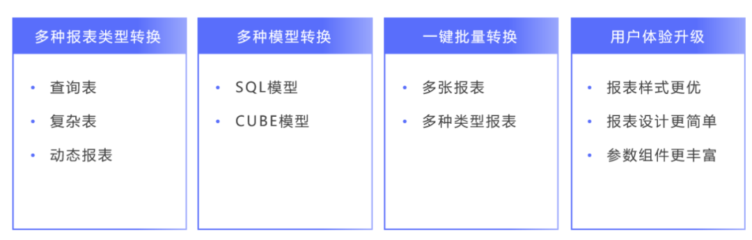 億信ABI覆蓋Cognos轉換各種場景,包括各類報表(查詢表、復雜表、動態(tài)報表等)、模型(SQL模型、CUBE模型、模型表等)的轉換都能完美適配,提供批量轉換功能,大大提高轉換效率。