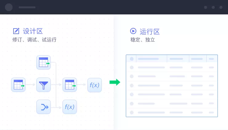 為保證運行環境的穩定可靠,提供了設計區與運行區隔離的機制,所有作業的修訂和更改通過在設計區完成調試和試運行后,通過發布機制,發布到穩定的運行環境,保證開發和運行兩不耽誤。